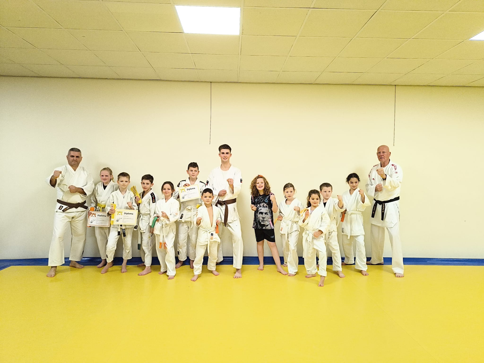 Op donderdagavond 20 november 2025 hebben we weer de voortgang geëxamineerd bij de jeugd. Onder grote belangstelling van (groot)ouders hebben de leerlingen allemaal hun best gedaan te laten zien wat ze nu al kunnen aan technieken en vormen. Iedereen heeft grote of kleinere stappen gedaan in de ontwikkeling en dat is mooi om te zien. De groep is de afgelopen maanden in aantal en kwaliteit beslist gegroeid. Dat heeft geresulteerd in de volgende uitslagen:
